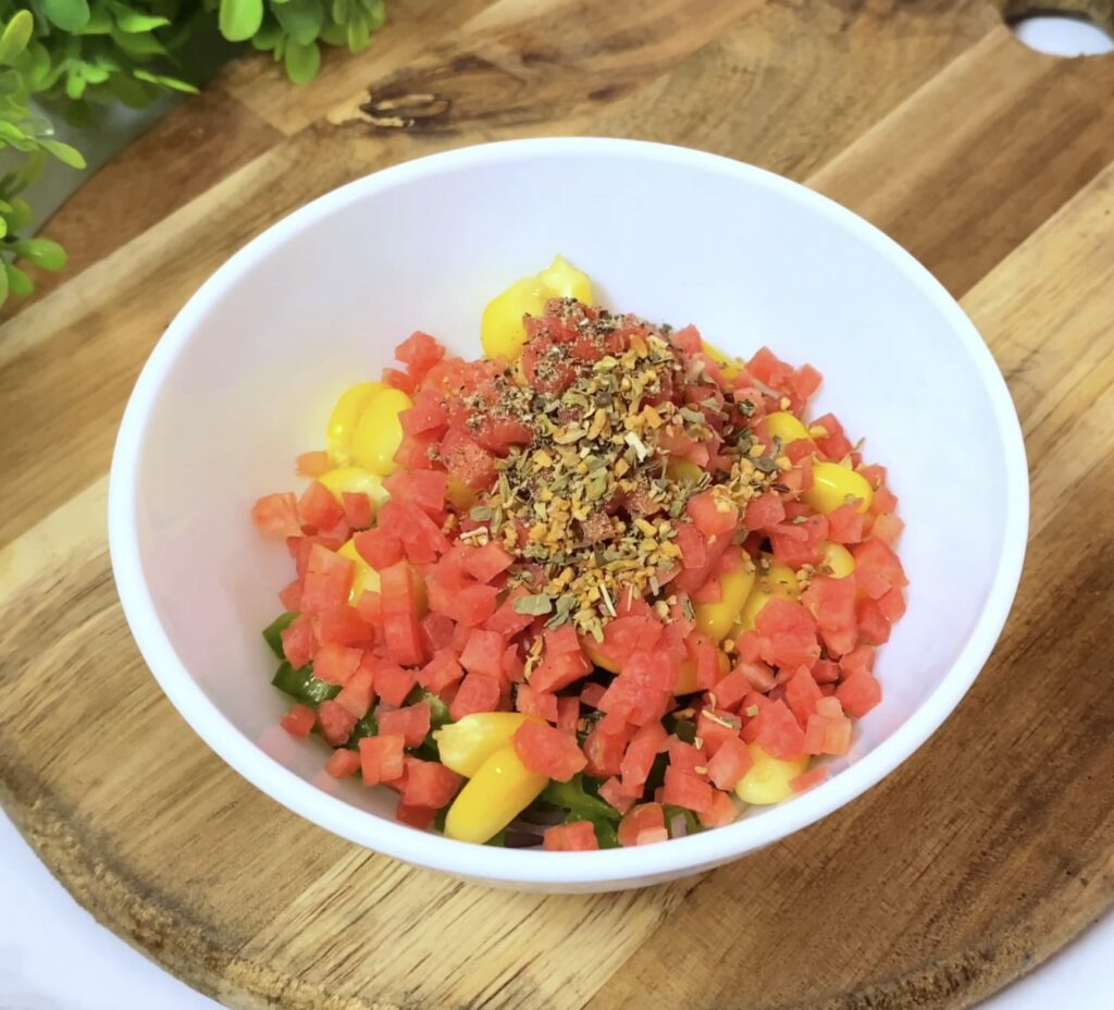 4. Meanwhile, mix onion, capsicum, corn, carrot, black pepper, oregano, and a pinch of salt to prepare the topping.