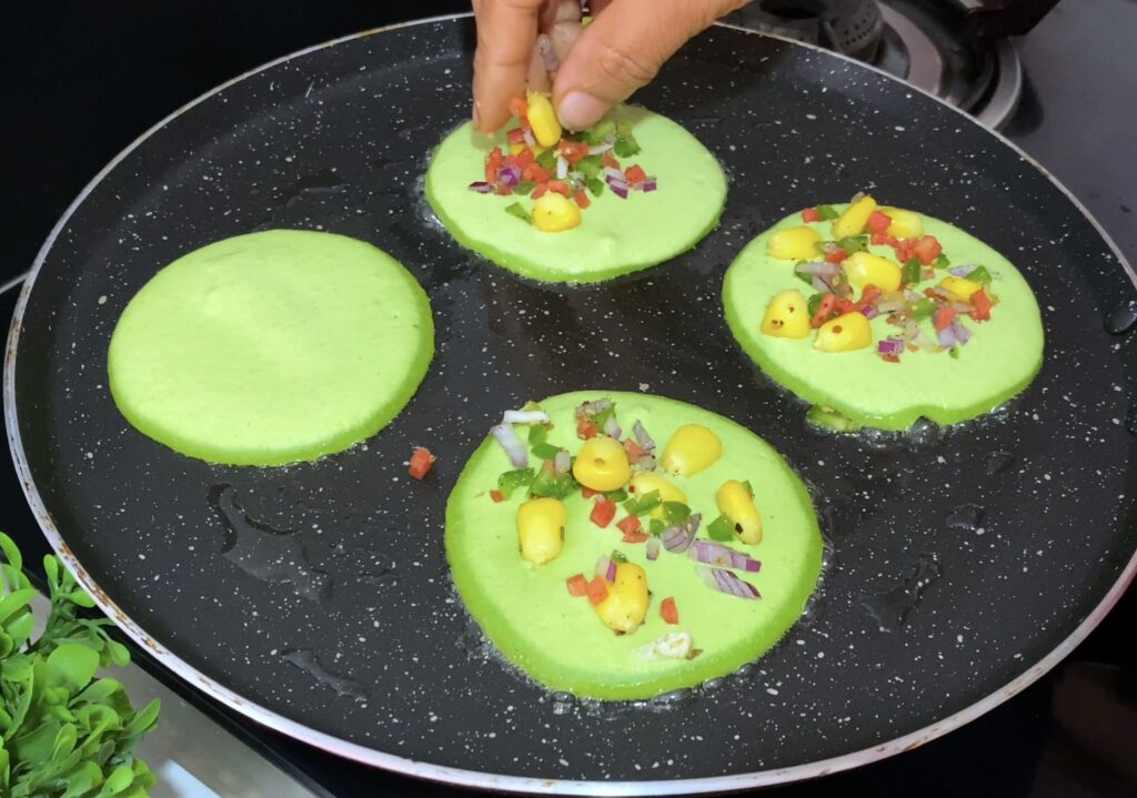 What makes this recipe special is how easily it comes together without any complicated steps. It does not require fermentation, deep frying, or expensive ingredients. The pancakes look vibrant because of the green batter and colorful toppings, and they taste fresh, soft, and slightly crisp at the same time. It is one of those recipes that feels homemade, healthy, and satisfying.