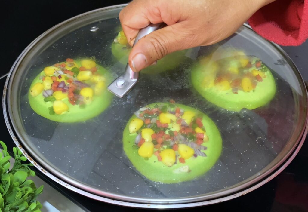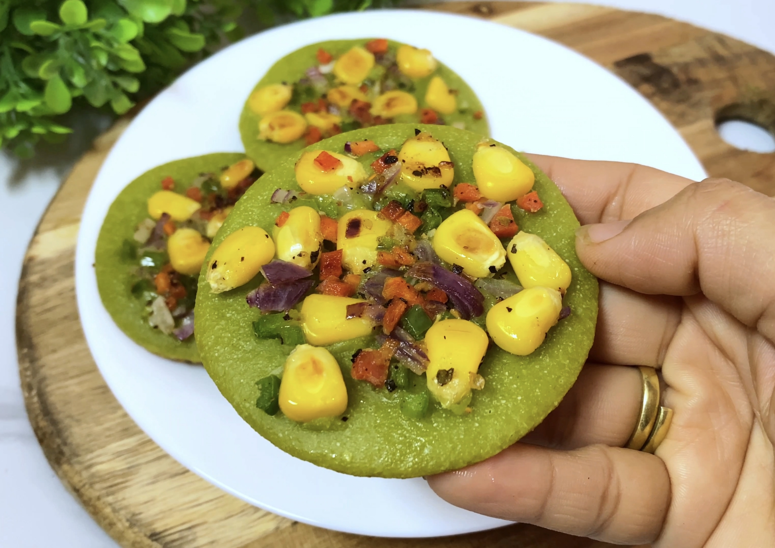 The key ingredients in this recipe are green peas, suji, curd, onion, capsicum, carrot, and corn. Together, they create a colorful, nutritious, and flavorful mini pancake that is perfect for breakfast, tiffin, or even a light evening snack.
