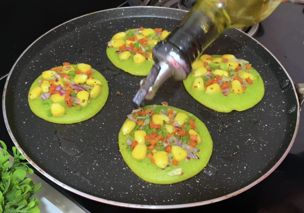 After preparing the batter, I let it rest for a few minutes so the semolina can absorb the moisture properly. This step helps the pancakes turn out soft from the inside while still getting a light crispness on the outside. Meanwhile, I finely chop the vegetables so they cook quickly and blend well with the pancakes.Once the batter is ready, I heat a tawa and lightly grease it with oil. I pour small portions of the batter to form mini pancakes and gently spread them. Then I sprinkle finely chopped vegetables like onion, capsicum, carrot, and corn on top and press them lightly so they stick to the surface. I cook the pancakes on medium heat until the base turns golden, then flip and cook the other side until both sides are nicely done.